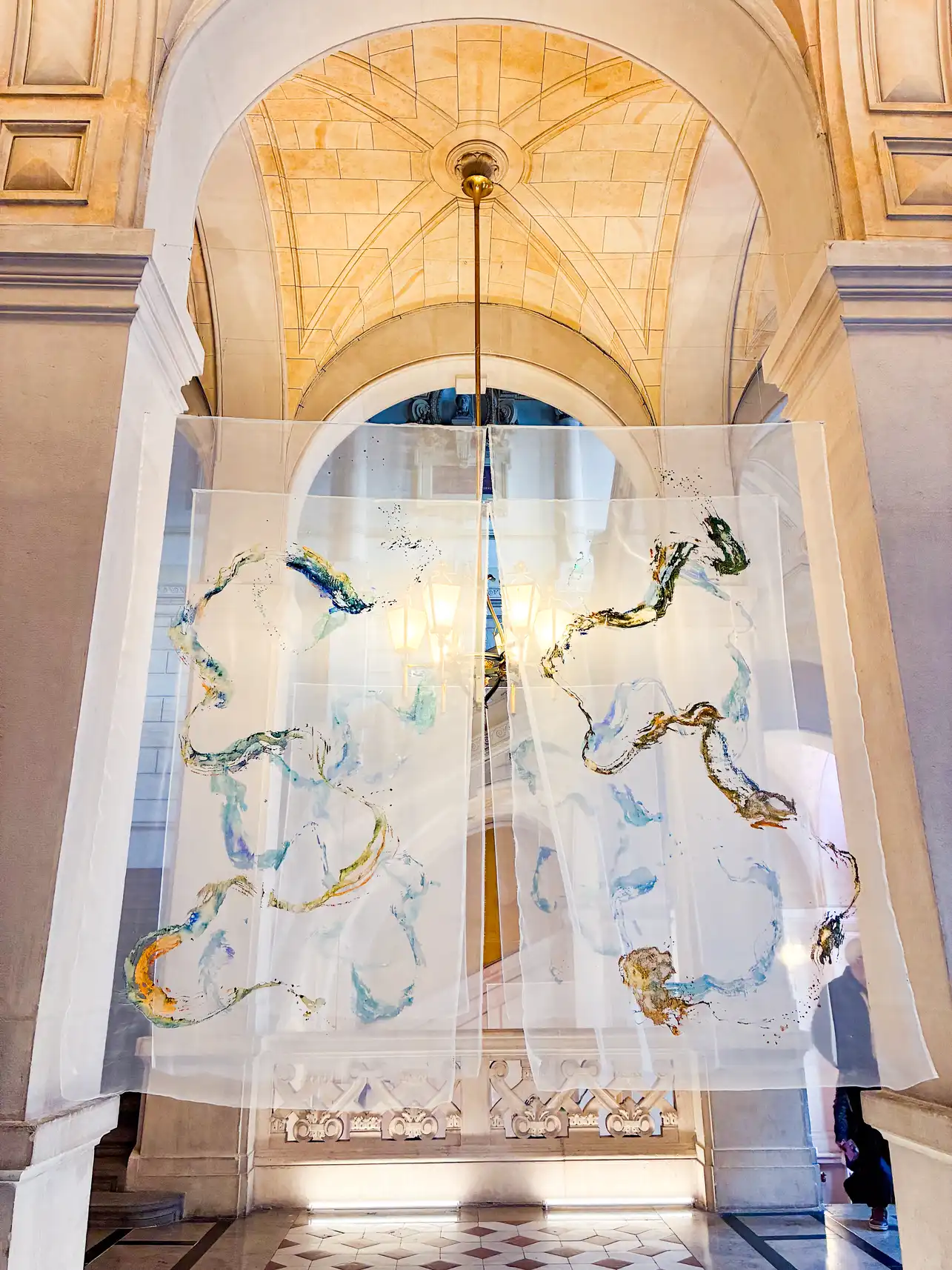 An immersive and cocoon space, where flying paintings on coton and silk softly touch the skin.